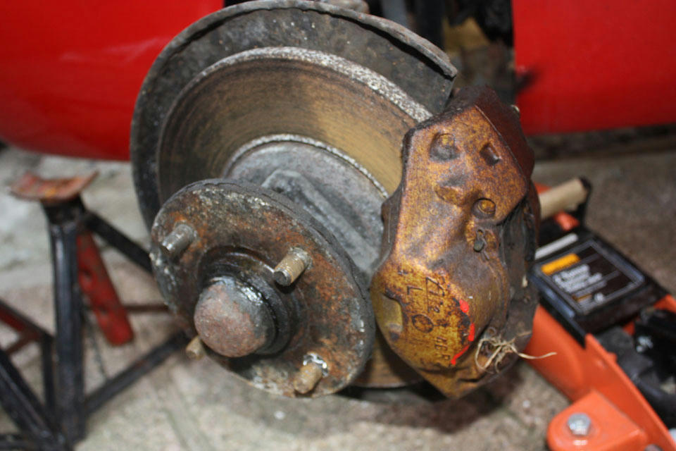 Moving on the front calipers, they are jammed I think so off they come. MKII Escort M16 jobbies.