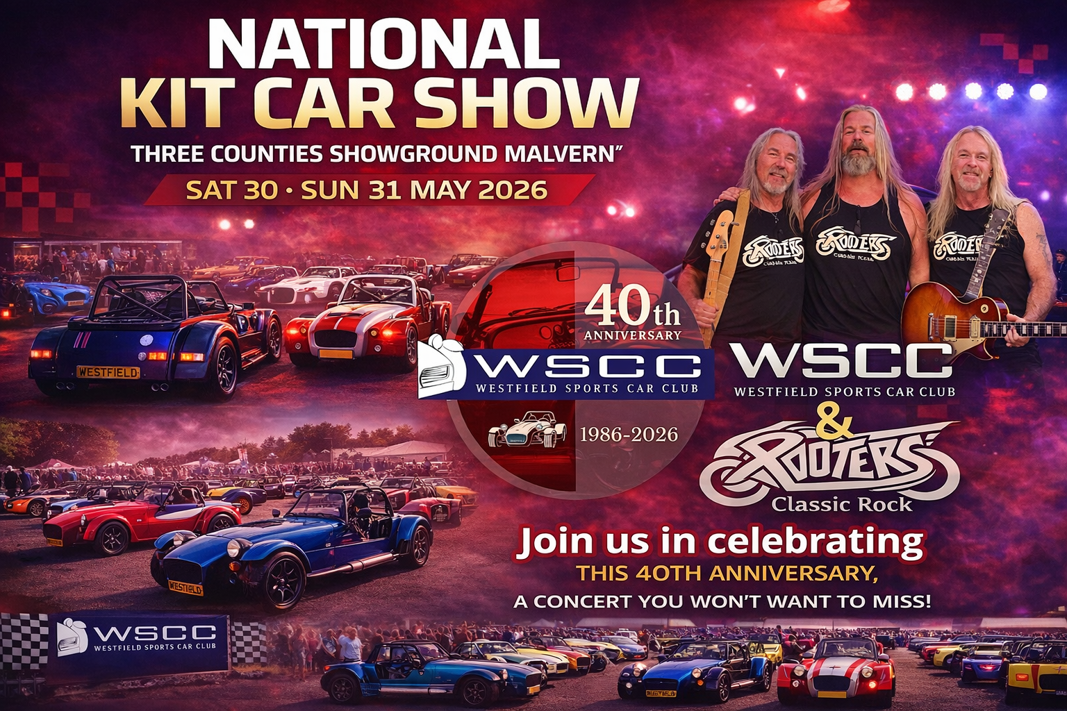 Westfield Sports Car Club – 40th Anniversary Celebration Join the Westfield Sports Car Club as we celebrate an incredible 40 years at the National Kit Car Show! Three Counties Showground Malvern Saturday 30th May Evening Celebration: 7:30pm – 9:30pm You’re Invited! This is not just for WSCC members – we’re opening the doors to ALL kit car owners, enthusiasts, manufacturers, and club members. No matter what you drive, you’re welcome to be part of the celebration. Live music from Rooters Surrounded by some of the finest kit cars in the UK A relaxed, social atmosphere to connect with fellow enthusiasts Whether you’re a long-standing member or new to the scene, come along and be part of a milestone moment in kit car history. All brands. All clubs. All welcome. Let’s make it a night to remember. #WSCC40 #KitCarCommunity #NationalKitCarShow #Westfield #CarEnthusiasts - Today