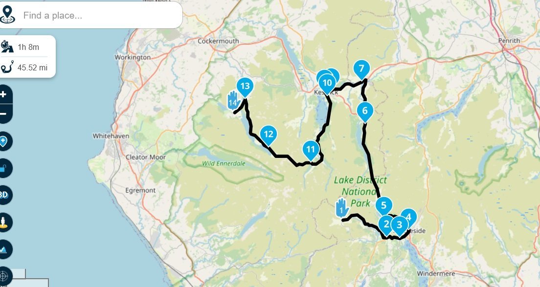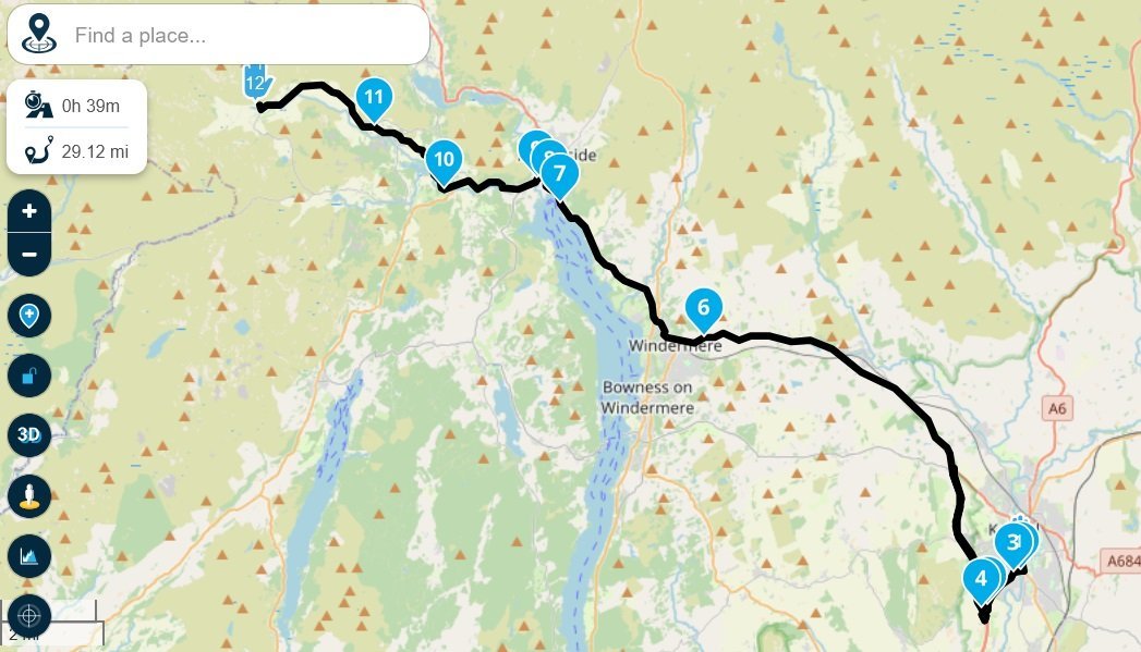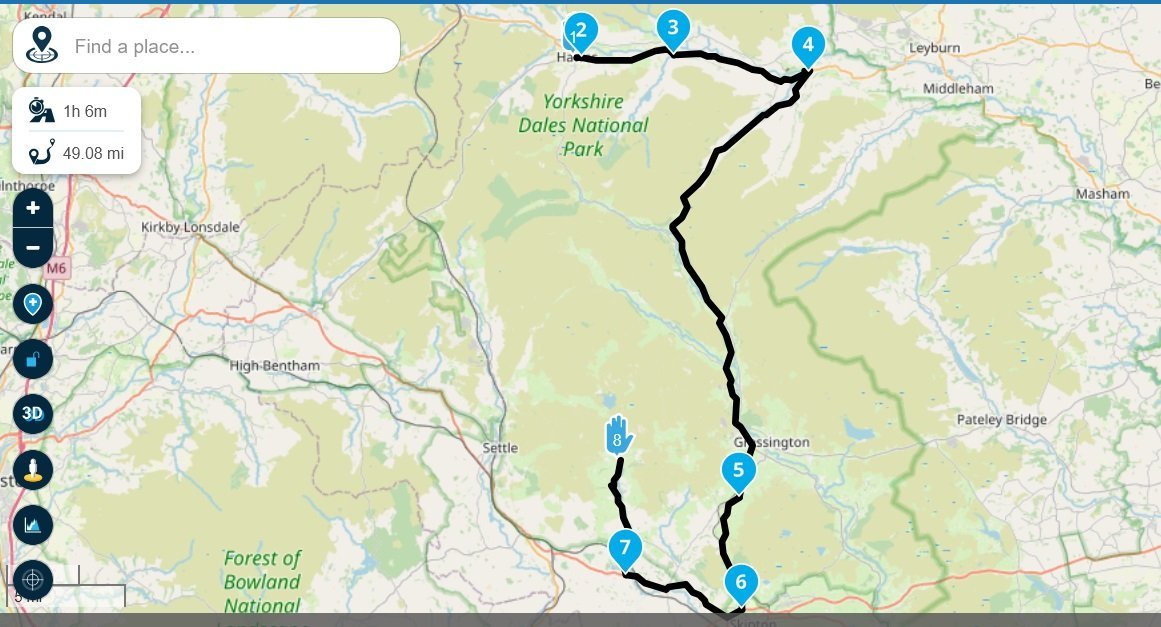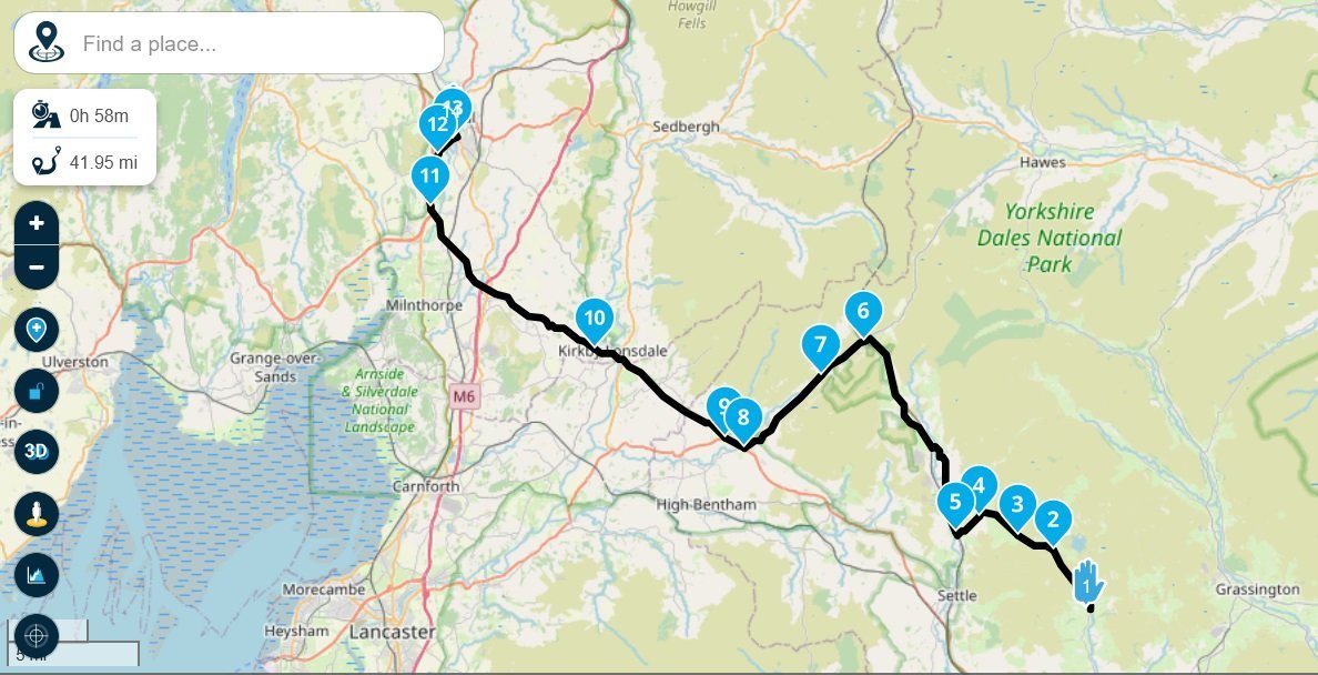 @tex hope this is helpful Day 1 1 Kendal to Old Dungeon Ghyll hotel 2 Old Dungeon Ghyll hotel to Kirkstile Inn 3 Kirkstile Inn to Kendal Day 2 4 Kendal to Hawes 5 Hawes to Malham 6 Malham to Kendal - Today