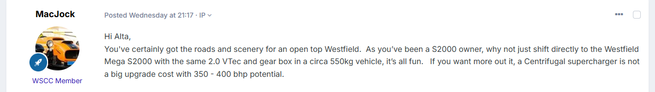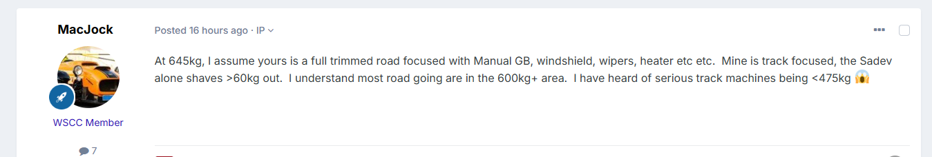 Hi @MacJock The above were from another thread. Let's continue this discussion here- I'm sure I'm not alone in being keen to learn what's been done to get your car down to 550kg! The standard S2000 Gearbox and bell housing is less than 50kg. Most Sadevs are circa 30kg, so I'm not sure how your gearbox swap has dropped 60kgs. My figure of 645kg's was from my IVA and I had a similar figure from a weighbridge in the Peaks, when we had a mass 'fat shaming' session! It's no problem if you've repeated a figure quoted by another, however it can be misleading in the Community if figures are banded about without facts. The S2000 is already a great Westfield and doesn't need inflated horsepower or unrealistic weights being claimed. - Today