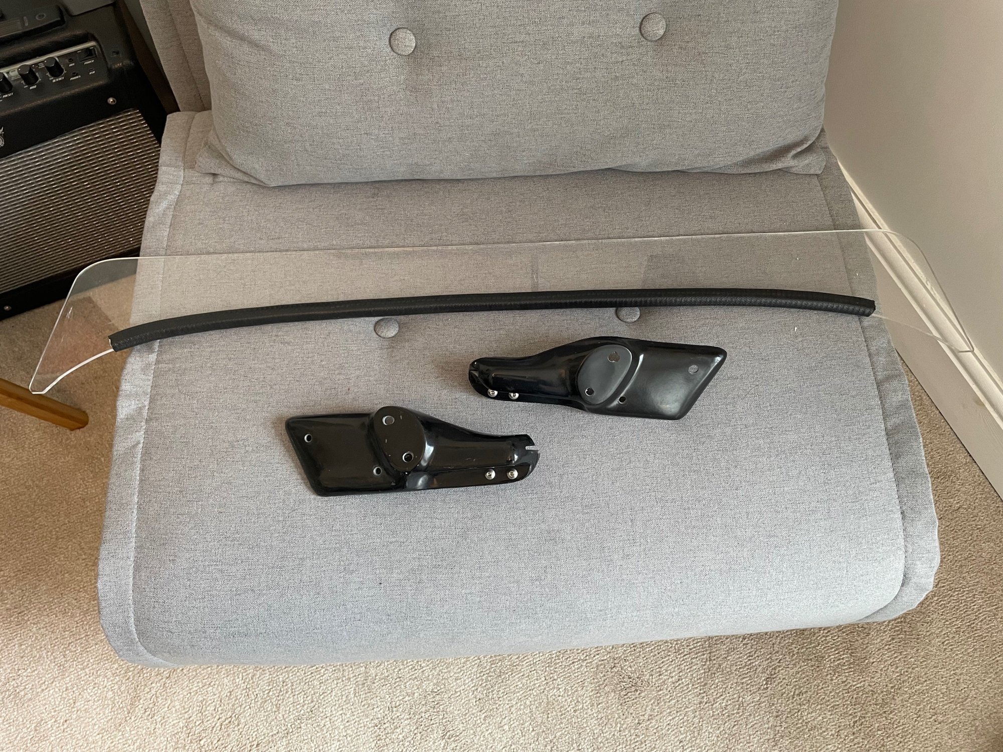 £50 plus postage For the SE/Narrow. These are no longer made. The setup uses a low poly screen attached to short fibreglass pillars that bolt into the standard windscreen mount holes so you can swap between them (I've put the original back on mine last year). You retain the standard fillet in front when fitting. I also added the bottom black edging as it located it into the slot a bit better. Two pics below (inside and out) when it was on mine.
